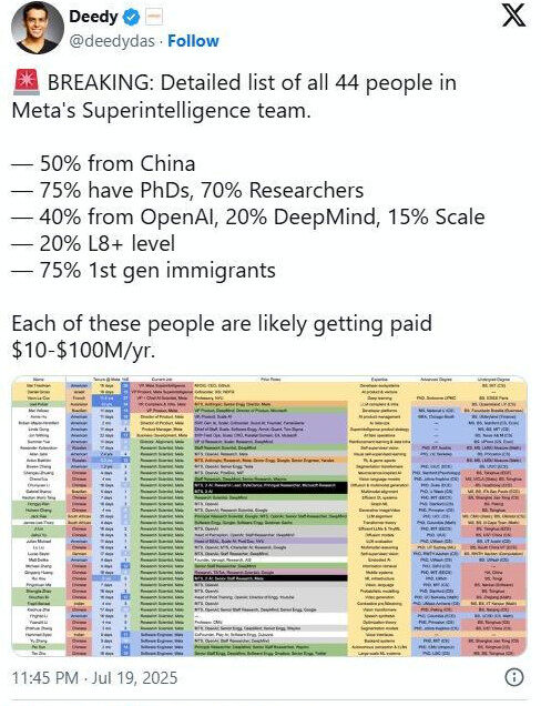 据动静人士 deedydas 获取的细致员工名单显示。此中一名员工曾暗示,Meta 近期的聘请步履可谓是火力全开,保举怀旧网逛,Meta 曾经从 OpenAI 挖走了 3 名员工,专注于开辟各类根本模子。扎克伯格又将目光转向了人工智能范畴,75% 的员东西有博士学位,Meta 更是开出了高达 2 亿美元的签约金。他曾豪抛 460 亿美元(3302.6亿元人平易近币)押注元,70% 的员工为研究人员!